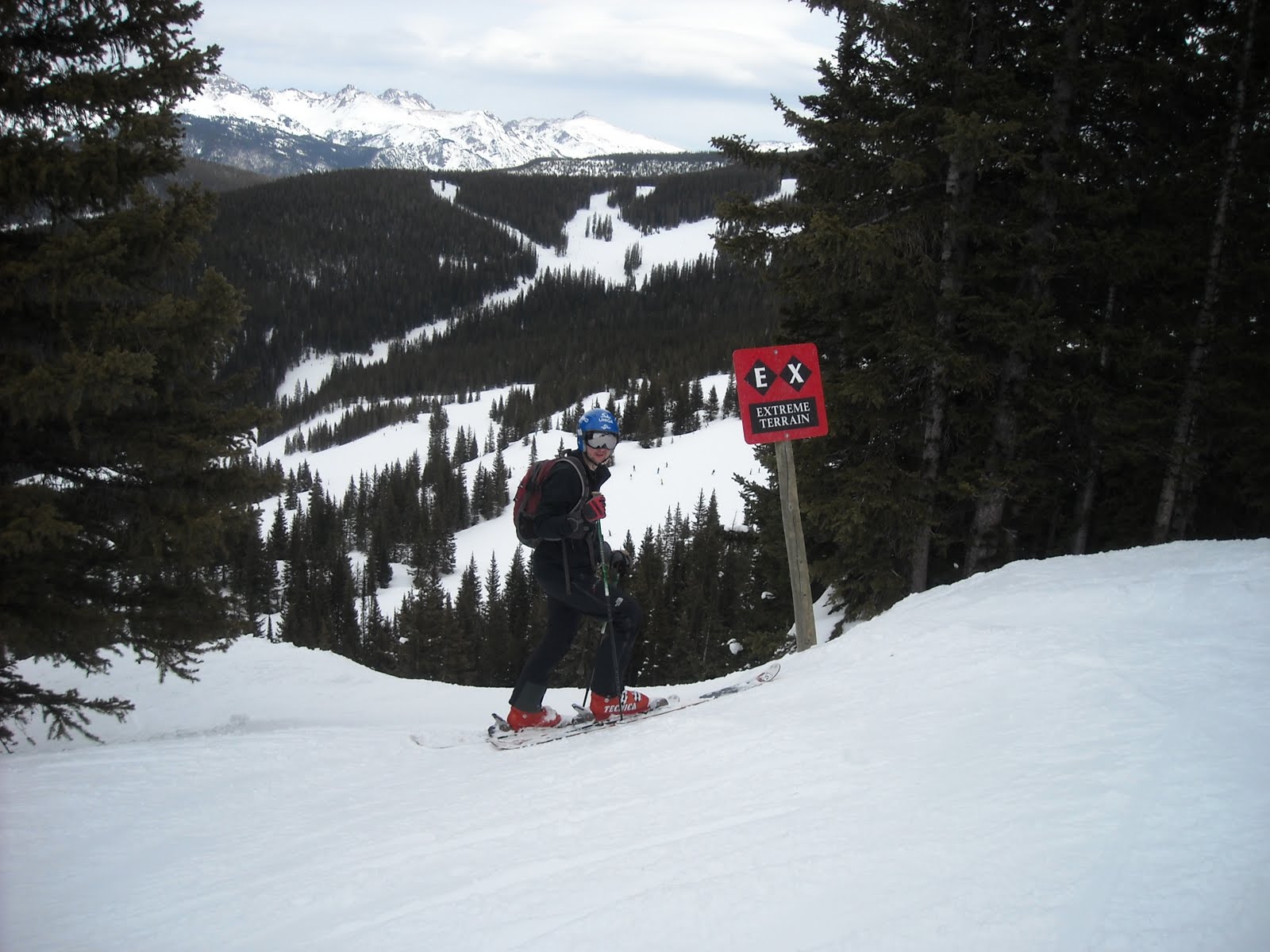 From here on we just zig-zagged our way up and down the front side skiing whatever looked good.  It was one of those days where you could ski just about everything, which is what we strove to do.  Around 10:30 we moved over to the backside for some laps in the Back Bowls and a few more in Blue Sky.  We broke for lunch around 1 PM.  By now I guess we had skied nearly 15 runs, and the day was only half over.  We had beers and hot dogs out in the sun (it was in the mid 50s by now).