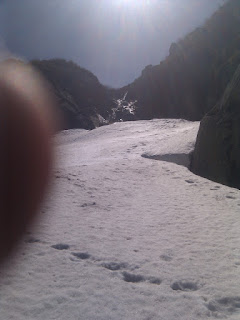 Clearly, there are numerous routes.  The mellowest of them, had the most snow and is probably the first thing I’ll try is called The Great Gully.  It is highlighted in red in the satellite map at the top of the post.  The bottom is pretty steep, punctuated by a waterfall which you probably have to huck depending on the snowpack.  Fortunately there is an extensive and mellow runout.  The midsection is highlighted by a weird fall line sloping to lookers right, toward a huge mess of rock and undermined snowpack.  Still pretty darn steep.  Above that, it opens up quite a bit and offers at least two spots from which to drop in providing some options.  This portion is the steepest – just in time for the narrow technical sections.  Sounds sick, right?  The rest of the aspects only get steeper and more technical.  Cannot wait.