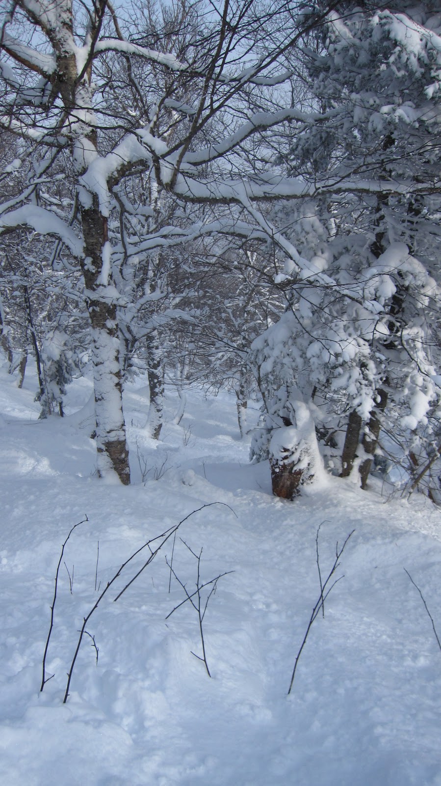 Jay got nearly a foot over Saturday night, and fortunately for us (but not so fortunately for every behind us) we managed to get the first chair up. We were among the first people to hit the woods to far skiers left (Beaver Pond and Andre’s). Again, there were a few bares spots, but mostly it was knee deep powder, with thigh deep drifts no uncommon. It snowed all day, and we continued to find fresh tracks until our last run of the day, just past 3. Behold: