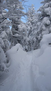 There are three real areas of interest at Bolton Valley. The main area of interest is the region to skiers right of the actual ski area. The x-country network comes close enough to the alpine area that you can follow it out of bounds and along the ridge. Once on the ridge, the idea is simply to find a clearing in the woods with enough of a pitch to make some good turns. The pitch eventually mellows out and runs into a brook which leads you back to the ski area. We blew it and dropped in too soon and missed a portion of the run, but an inspection of the topo maps shows that some decent turns are to be had in this area. We managed to find fresh tracks for a good part of the way down.